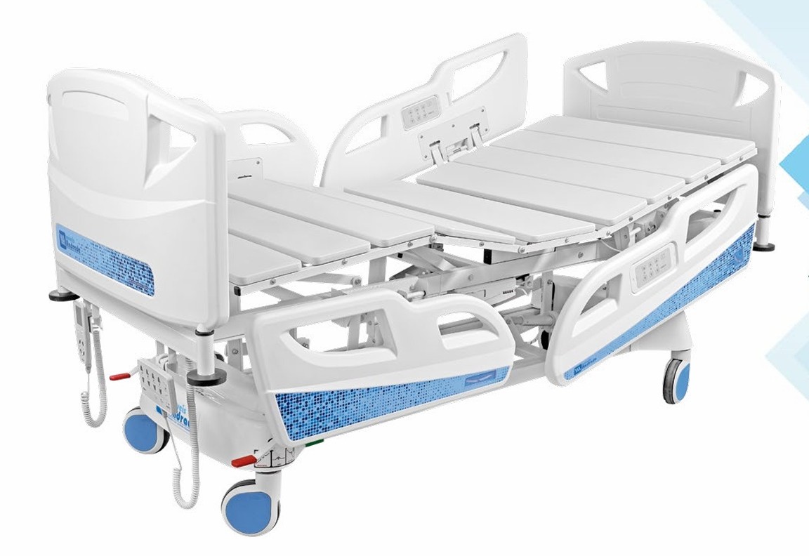 CABECEIRA E PESEIRA: removíveis produzidas em PEAD (polietileno de alta densidade) material 100% virgem, de alta durabilidade e robustez, trazendo conforto e ergonomia no manuseio.- BASE: recuada, construída em tubo de aço retangular 50 x 30 x 2,0 mm, revestida por carenagem em material termoplástico de alta resistência. - ESTRADO: construído em metalon de aço carbono retangular 50 x 30 x 2,0 mm. - LEITO: fabricado em metalon de aço carbono quadrado 30 x 30 x 2,0 mm, articulado em 4 seções revestidas em PEAD (polietileno de alta densidade) removíveis e de fácil assepsia. - MOVIMENTOS/MOTORES: dotado de 4 motores elétricos que executam os movimentos fowler, semi-fowler, cabeceira, dorso, pernas, sentado, cadeira cardíaca, vascular, flexão, joelhos, poltrona, auto contorno, elevação do leito, trendelemburg e reverso de trendelemburg (proclive), sendo 2 instalados sob o estrado e 2 instalados na base, dotados de fim de curso, para proteção, blindados, alimentação elétrica 127-240 Vca – 50/60hz, com unidades de bateria 24 v 1,2 ah, recarregáveis. Nível de proteção contra penetração de água IPX 6.- GRADES: dois pares de grades laterais, sendo um par no dorso e um par na perna, produzidas em PEAD (polietileno de alta densidade) material 100% virgem, de alta durabilidade e robustez, trazendo conforto e ergonomia no manuseio, conforme norma técnica ABNT NBR IEC 60601-2-52; Grades laterais com articulação retrátil e independentes sustentadas por cilindros pneumáticos com acionamento fácil e rápido por leve toque e pressão e recolhimento total sob o leito, facilitando a transferência e o acesso do paciente, possui indicador de ângulo localizado no dorso e na peseira.- CONTROLE DIGITAL COM TECLADO DE MEMBRANA BLINDADOS: 2 localizados nas duas grades laterais existentes no dorso da cama, com acionamento interno e externo, 1 localizado na peseira com controle geral dos movimentos da cama inclusive travamento dos movimentos. Esse sistema de controle tem a possibilidade de reposicionamento em diversos pontos do leito, também facilmente acessado pelo paciente, acompanhante ou operador da equipe médica e desde que liberado pelo controle supervisor A.C.O, aciona os atuadores do dorso, pernas e elevação do leito.- PARA-CHOQUE: fixado às extremidades para proteção contra danos por choques em paredes e/ou outros móveis - Rodízios: de 150 mm de diâmetro com banda de rodagem condutiva em poliuretano, com sistema de movimento/ freio acionado por um único pedal, colocado em dois lados da base da cama, permitindo o movimento livre dos 4 rodízios em todas as direções, podendo direcionar 2 rodízios para longos cursos e travar os 4 rodízios, impedindo que a cama se movimente.- BALANÇA: incorporada a cama para pesagem do paciente, eliminando a necessidade da remoção do paciente para aferição de peso de modo separado. Com controle digital localizado na parte externa da peseira, de fácil manuseio, através de um único toque, mantém o peso do paciente, sendo possível a inclusão ou a retirada de acessório sobre a cama ou sobre o paciente, pesando-o em qualquer posição. - ACABAMENTO: em pintura eletrostática a pó com resina epóxi-poliéster e polimerizado em estufa, excelente resistência química e mecânica, após tratamento antiferruginoso. - CAPACIDADE: até 380 kg.- As cores do acabamento em pintura variam de acordo com a opção do cliente sendo os padrões branco ou bege. Dimensões- Externas 2,08 x 1,049 m (+/- 0,15 m).- Internas 1,90 x 0,90 m (+/- 0,15 m).- Atura mínima do leito 0,43 m (+/- 0,3 m).- Altura máxima do leito 0,78 m (+/- 0,3 m).